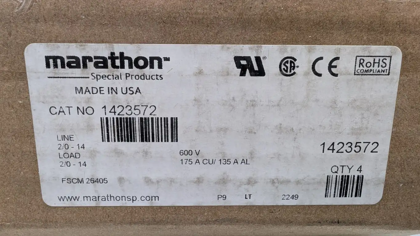 4 Pack Marathon 1423572 Terminal Block 3-POLE 2/0-14 600V 175A CU/135A AL - New