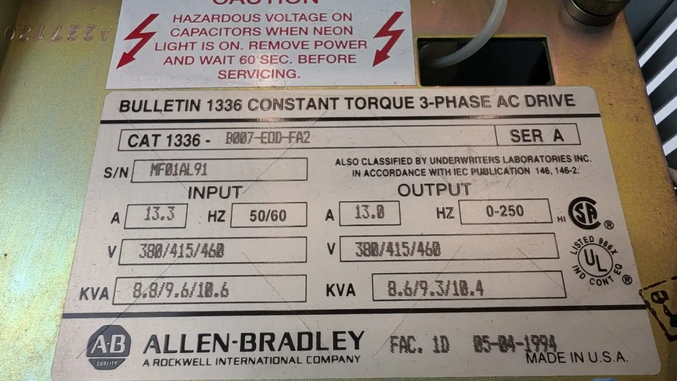 Product Details for Allen-Bradley 1336-B007-EOD-FA2 Constant Torque AC Drive 1336-MOD-L3 Ser A 0-250Hz