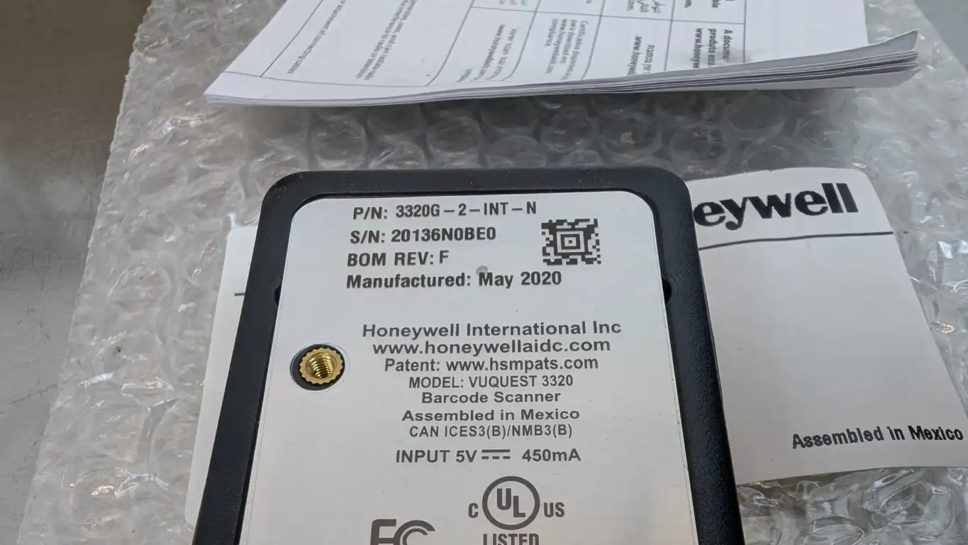 Product Details for Honeywell 3320G-2-N Barcode Scanner 3320G-2-INT-N VUQUEST3320 Rev F 5VDC 450mA