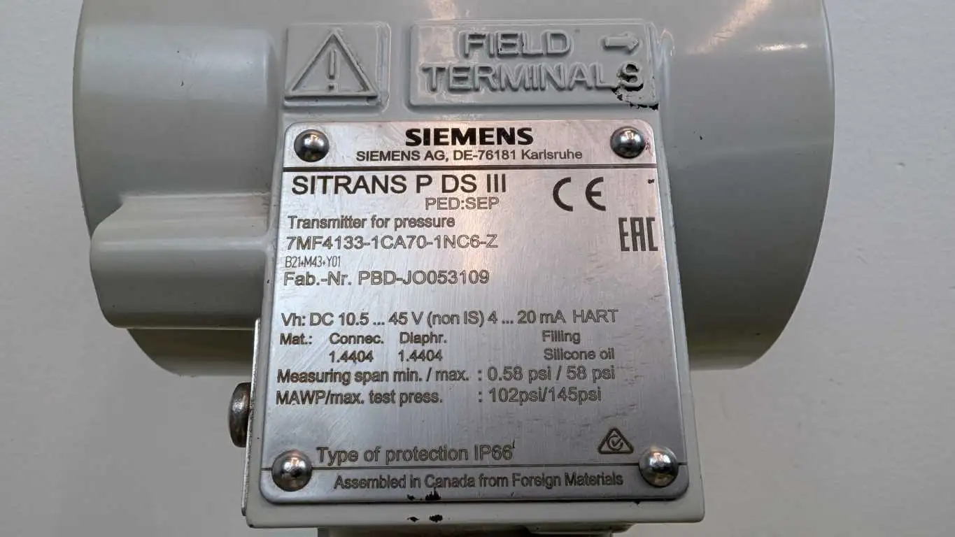 Siemens 7MF4133-1CA70-1NC6-Z Pressure Transmitter SITRANS P DS III 0.58-50 PSI - Used