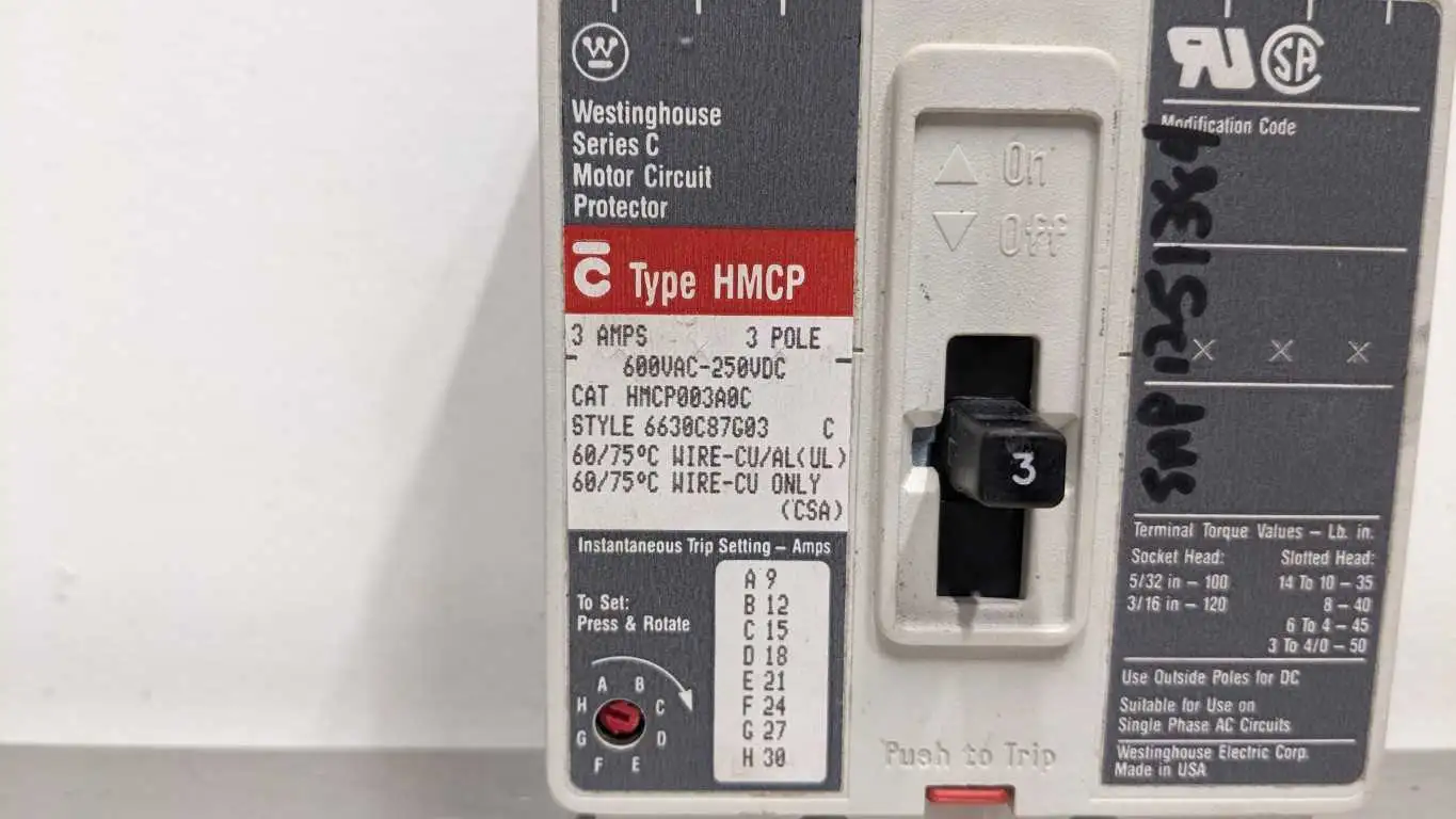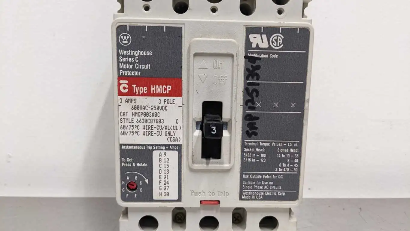 Product Details for Westinghouse HMCP003A0C Circuit Breaker 600VAC 250VDC HMCP Ser C 600VAC 250VDC